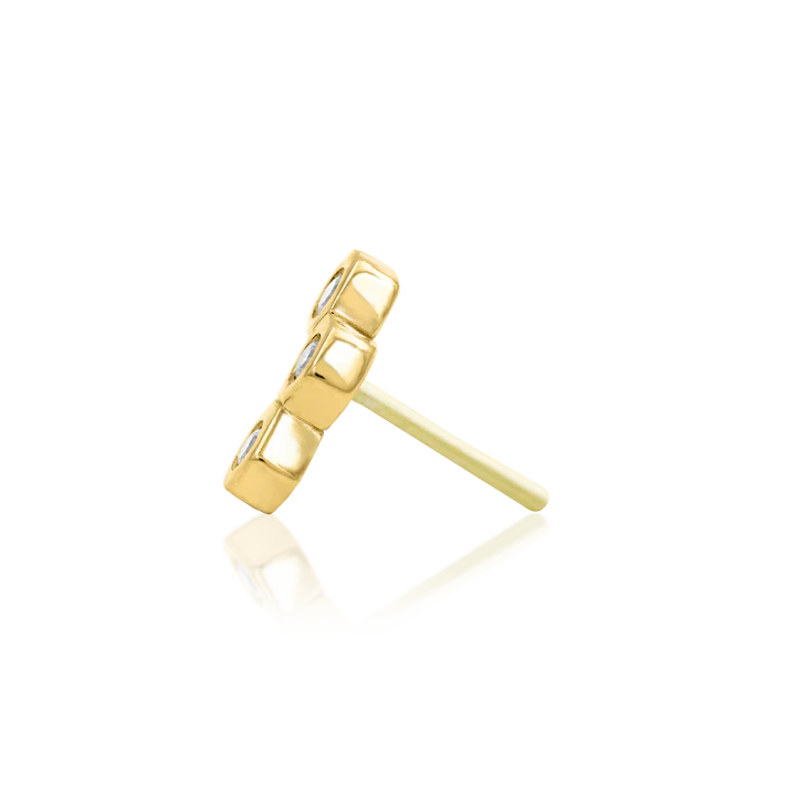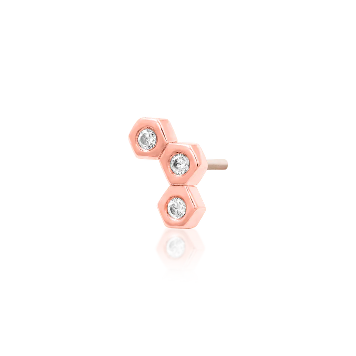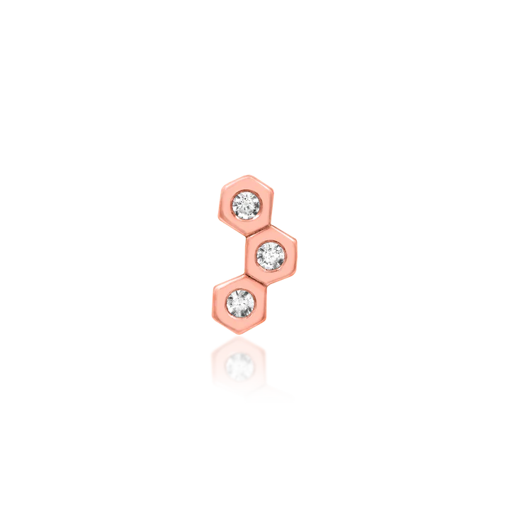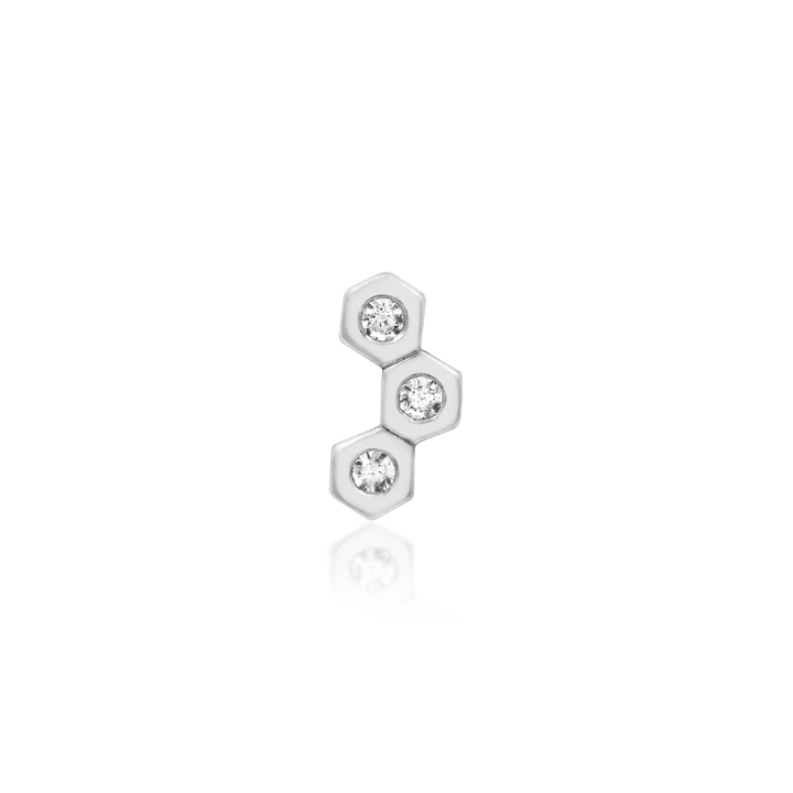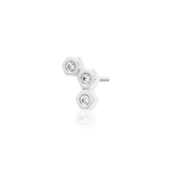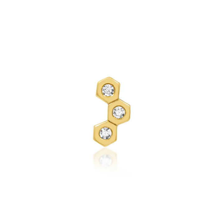 Buzzin ist Teil der „Oh Honey“ Kollektion und ein Cluster der außergewöhnlichen Art. Die Honigwaben legen sich durch die Biegung sehr schön in Helix- oder Conch-Piercings, lassen sich aber auch im Flat oder Tragus gut tragen.